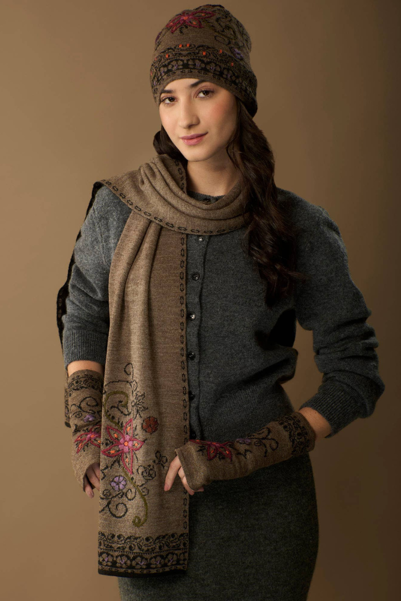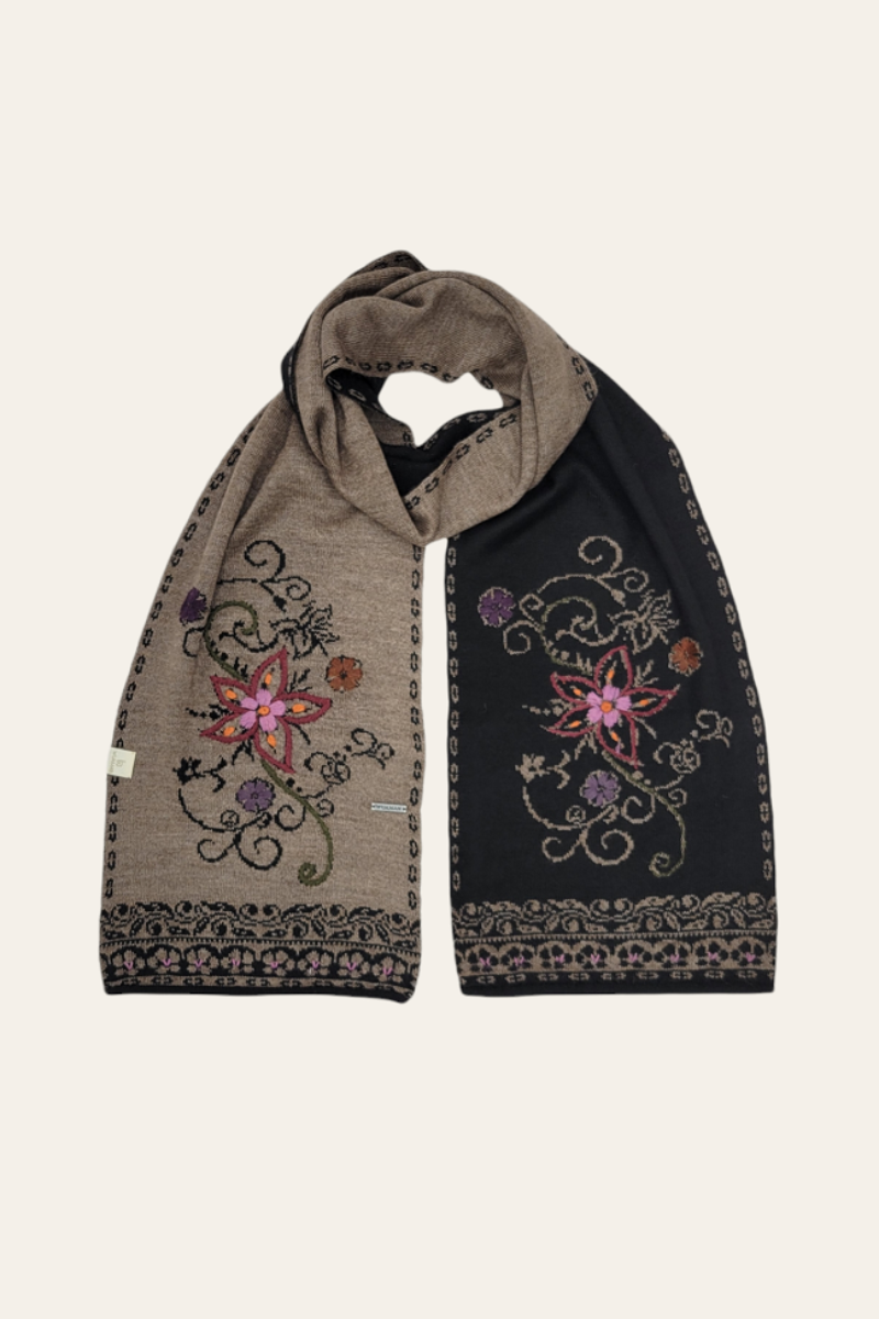 Knitted alpaca scarf with a hand-embroidered floral design. Available in Taupe & Blue.