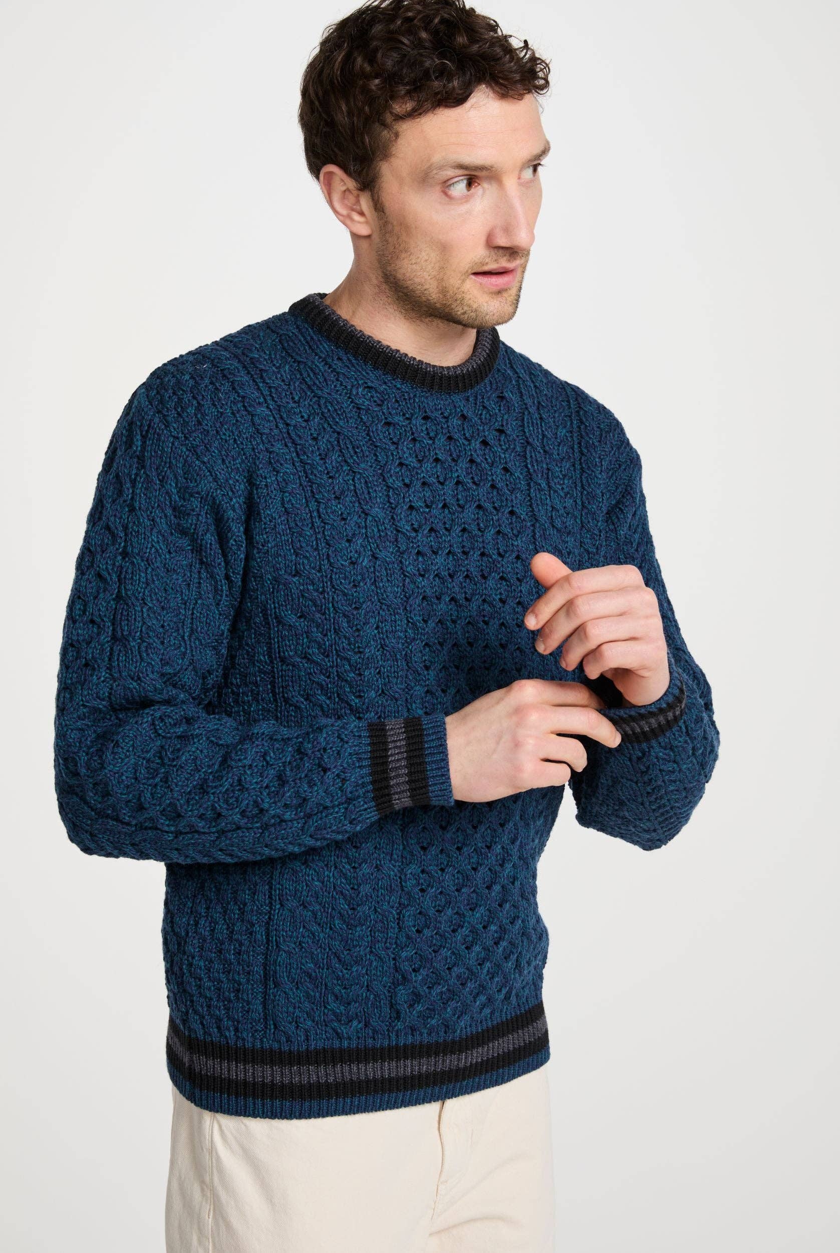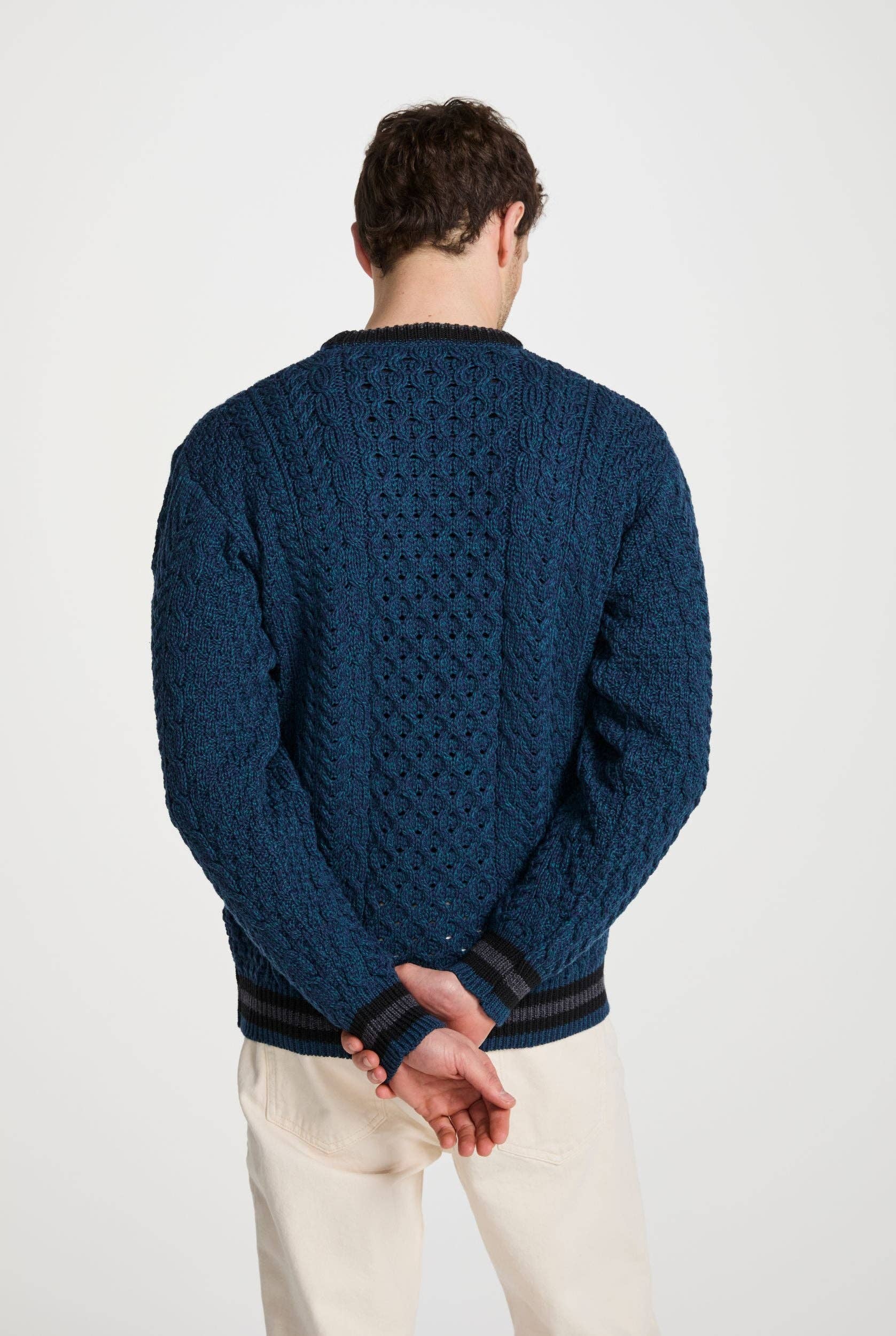 This mens sweater reimagines the traditional Aran sweater into a new, preppy, sporty piece with the addition of contemporary stripes. Also available in green.