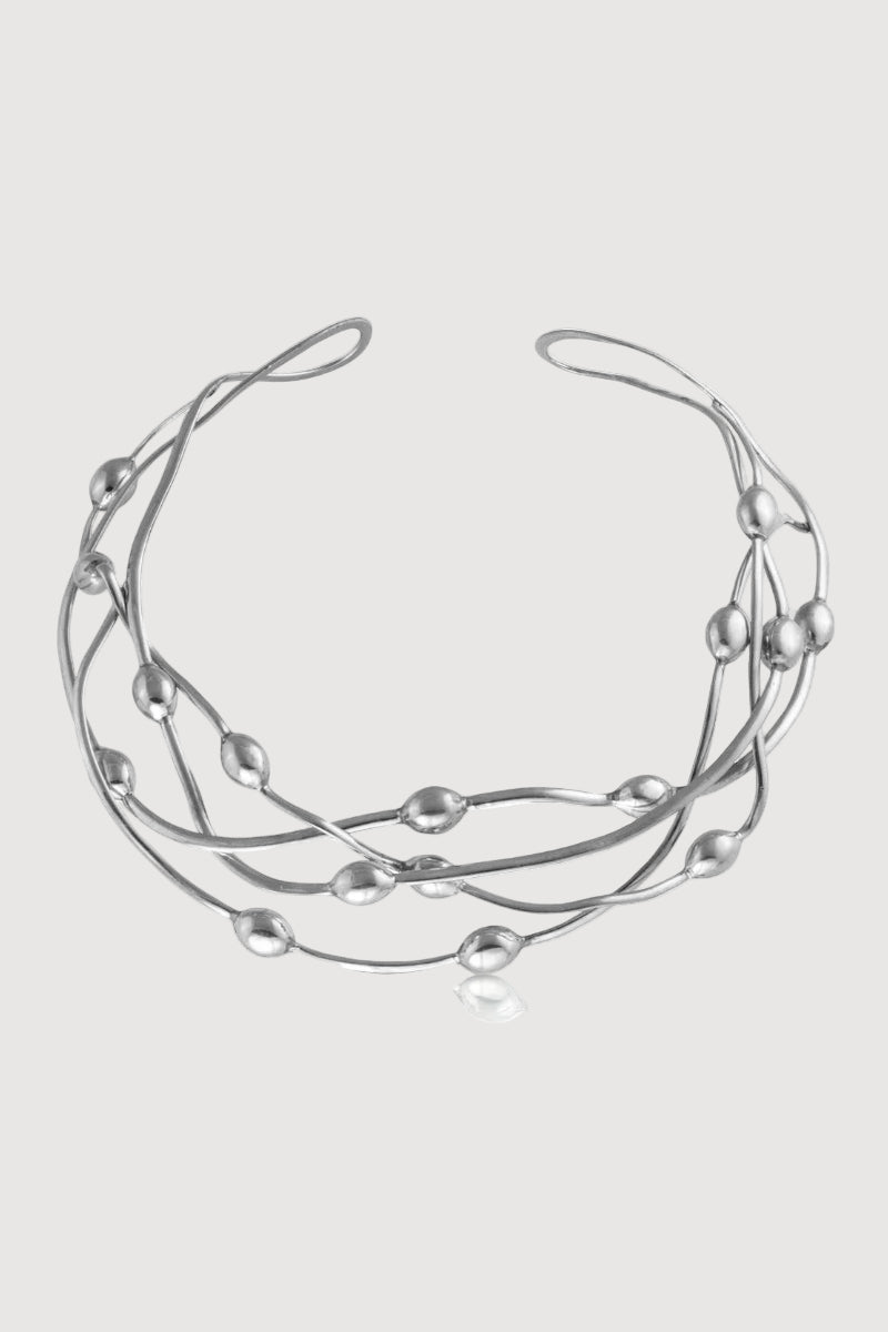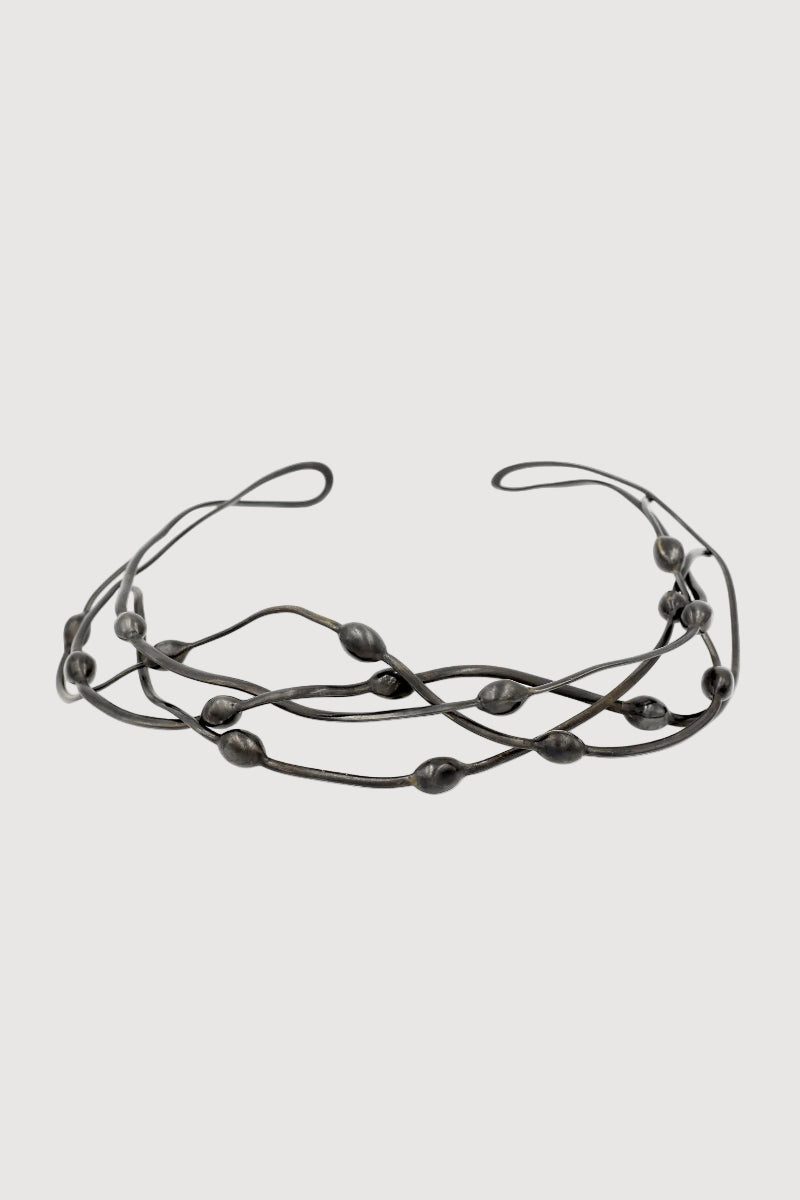 This necklaces is inspired by New England seaweed. Found dried and scattered along the New England shoreline, it remains equally as beautiful and has been a great source of inspiration in Gogo’s designs including bracelets, necklaces, earrings, and large wall sculptures. Made from Alpaca & Tumbaga (a combination of copper, nickel, and zinc)