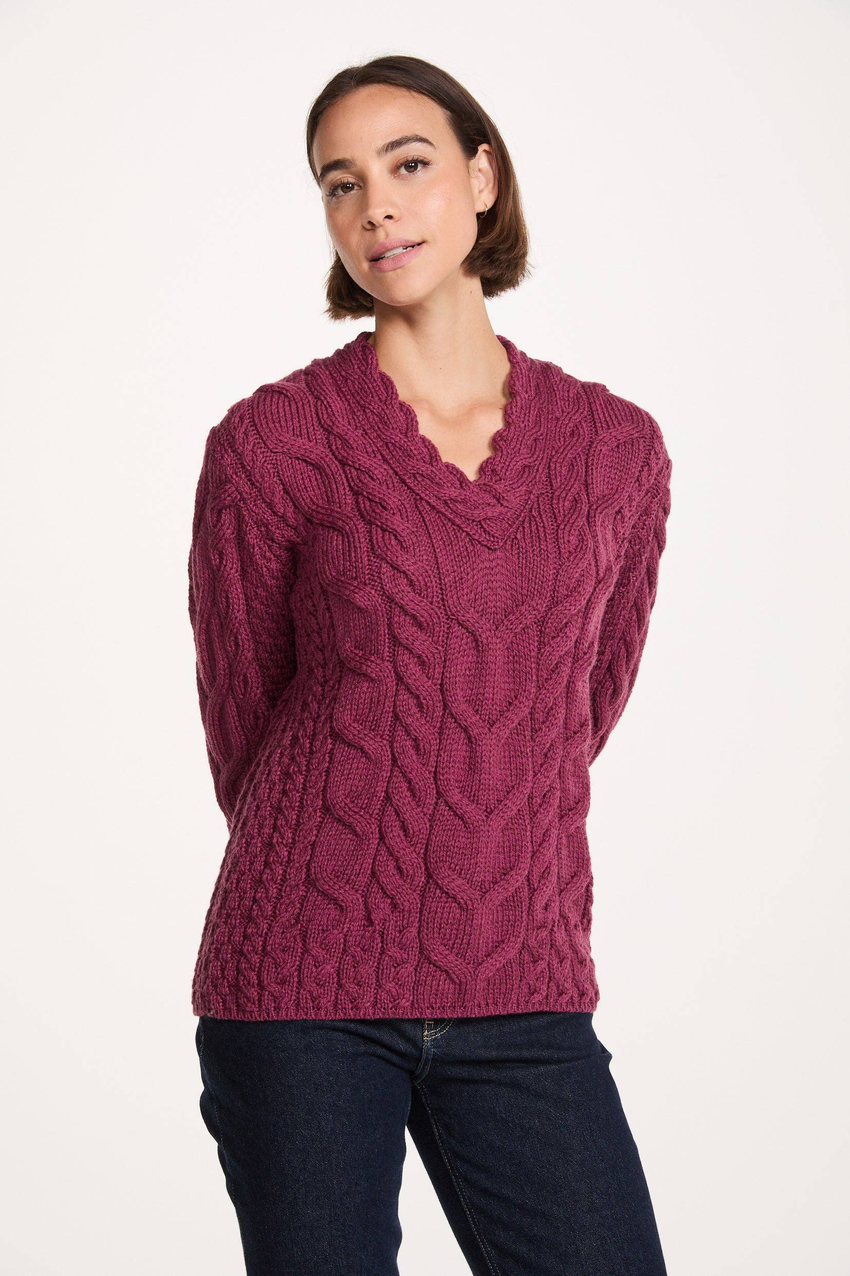 The Tralee is a timeless and elegant sweater created with a silky-soft Merino wool, gently fitted to flatter the form with a sculptural cable knit draws and V-neckline beautifully accentuated a graceful, scalloped finish.