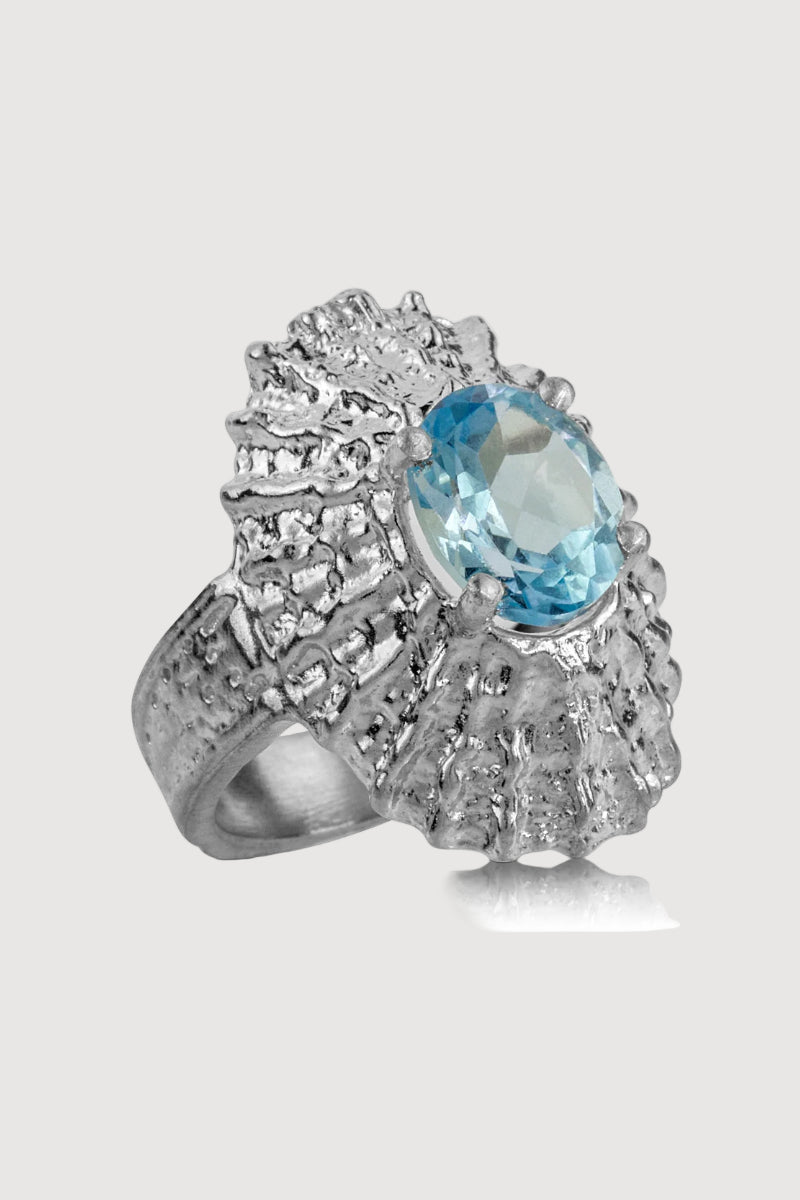 With an Armadillo Shell band that meets the inner ridges of the limpet shell, this ring connects land and sea in the most beautiful of ways. Taking it one step further, the limpet has been reimagined to have topaz as a shimmering crown.
