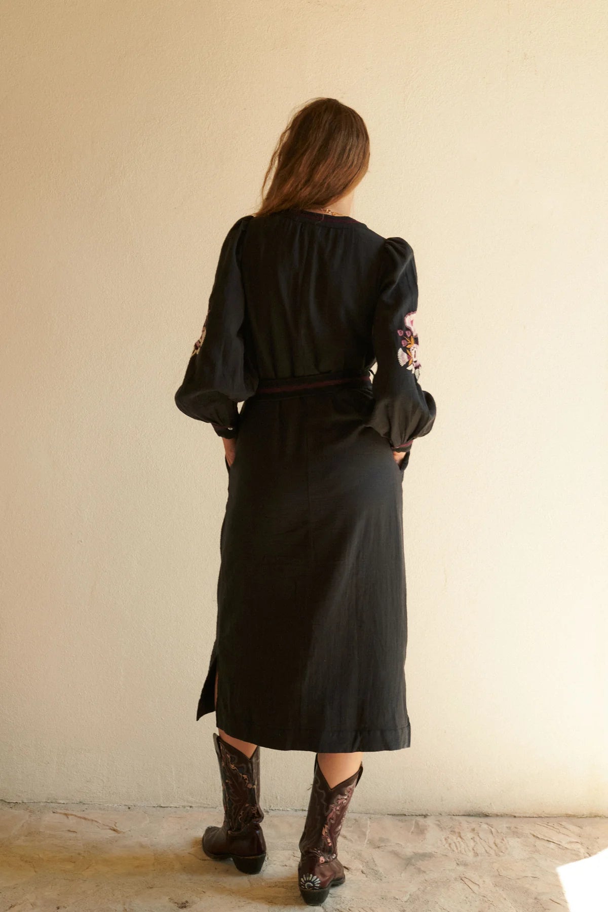 It features delicate and enriched embroidery adorning the dress, while embroidered bands gracefully accent the entire front panel and cuffs, adding an artisanal touch of refined detail. Can be worn can with self-tie belt or loose.