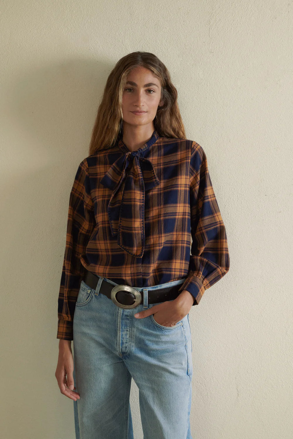 The new long sleeve blouse Lily is crafted from the softest flannel in an enchanting plaid pattern, it captures the essence of cozy elegance with sophisticated charm. Blouse features delicate geometric embroidery beautifully adorning the bow tie and cuffs, designed with a classic straight-cut pattern.