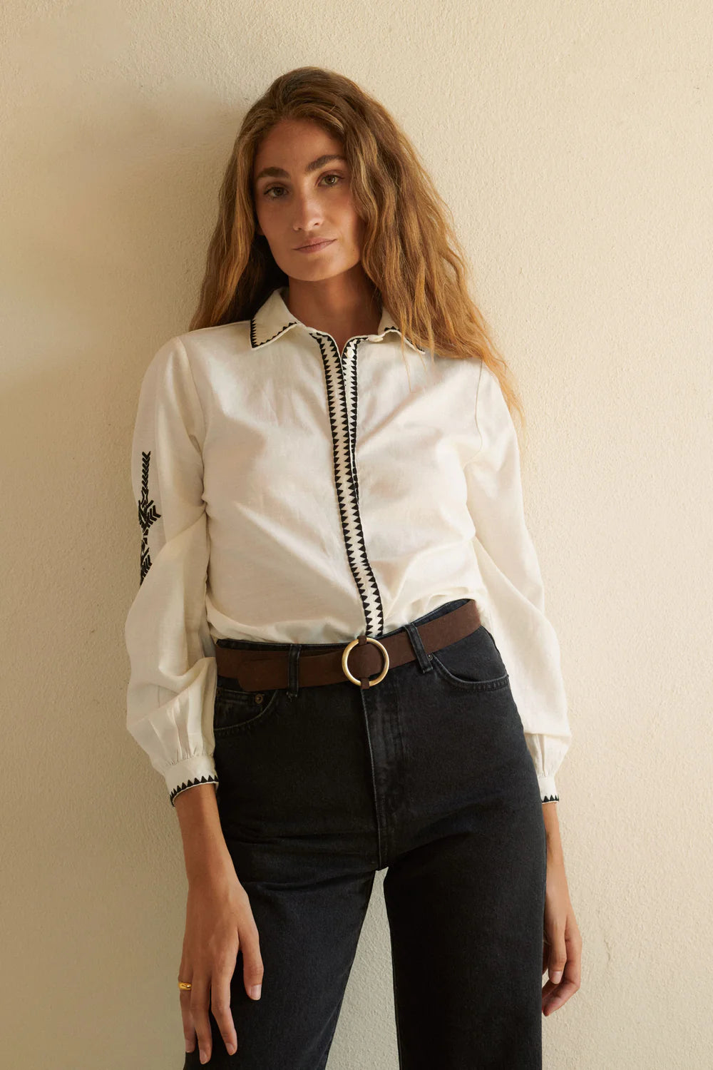 A bohemian-inspired design that celebrates our distinctive embroidery craftsmanship in every carefully considered detail. Signature embroidered sleeves return in this blouse with a more boho aesthetic, while intricate embroidery adorns the entire placket and collar, creating a beautifully detailed piece that elevates casual elegance