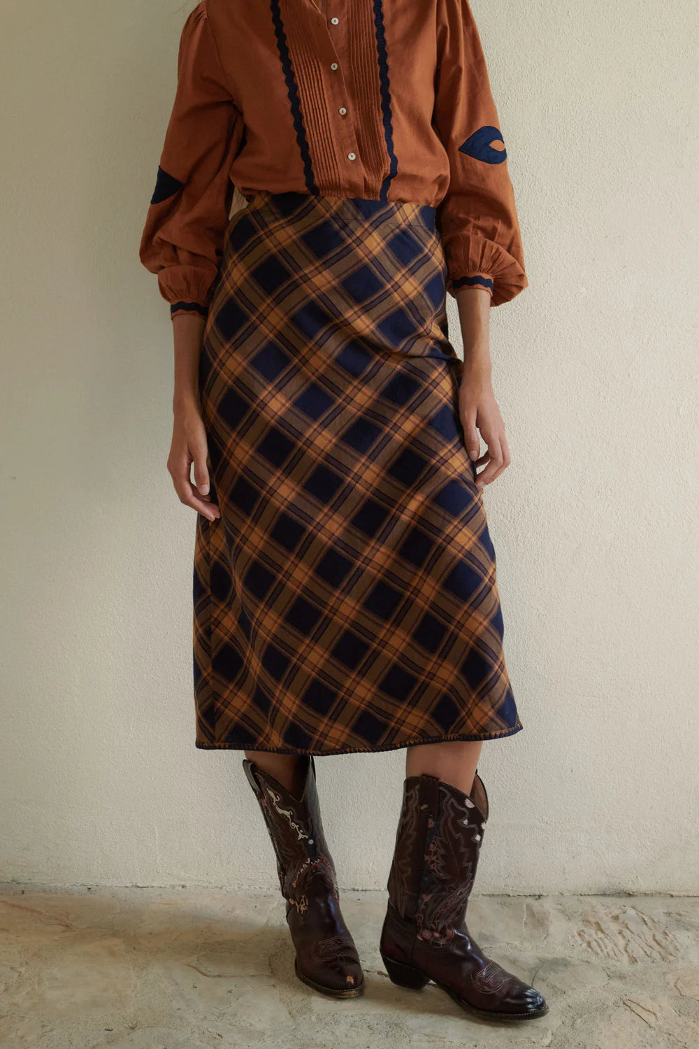 Classic A-line midi skirt in soft flannel with timeless plaid pattern. Features a sleek side zipper for a modern finish. The flattering silhouette and versatile design make it perfect for both professional and casual looks.