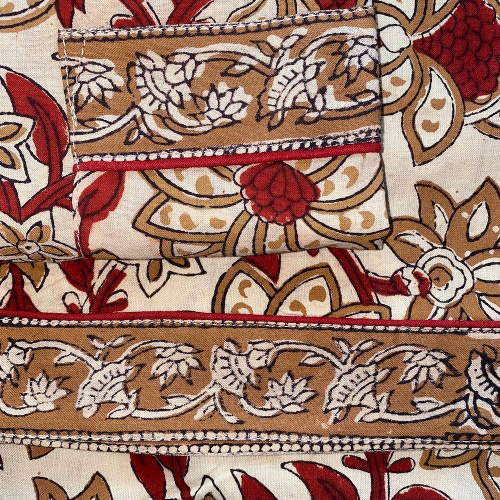 These block printed pajamas were made with soft Indian cotton and printed by hand with natural dyes including madder root (red), gum arabic tree (brown), and turmeric. They are so comfy you will feel like a queen. Each set includes a button down top, pants and a matching bag to store them in. The button-down pajama top has colorful piping all around. The pants have a soft elastic waist and drawstring. The pants have a piped cuff. They are great for lazy Sundays around the house, Netflix and a glass of wine, or a chilly evening around the fireplace. They make the perfect Christmas gift! PRODUCT DETAILS: *100% cotton voile *Natural dyes *Hand wash and air dry *Matching block printed bag