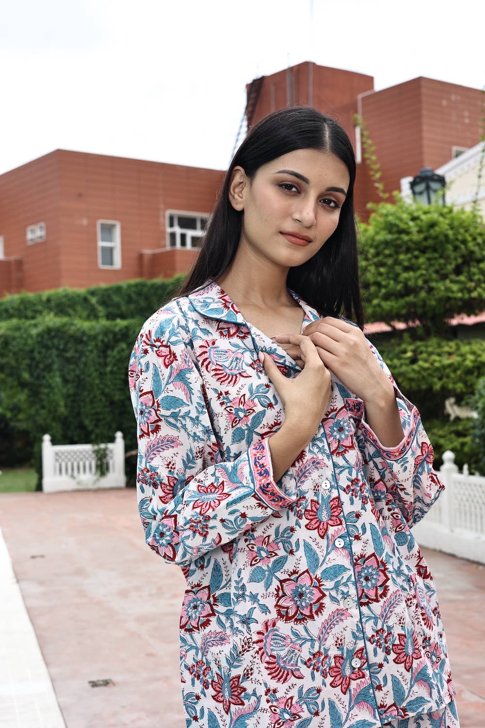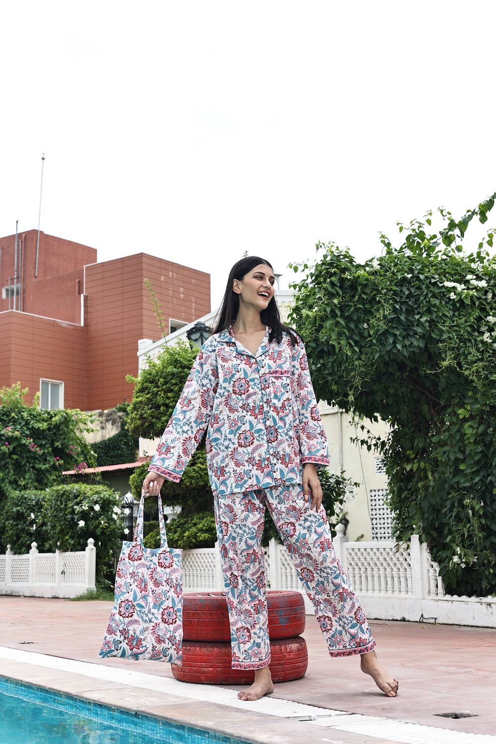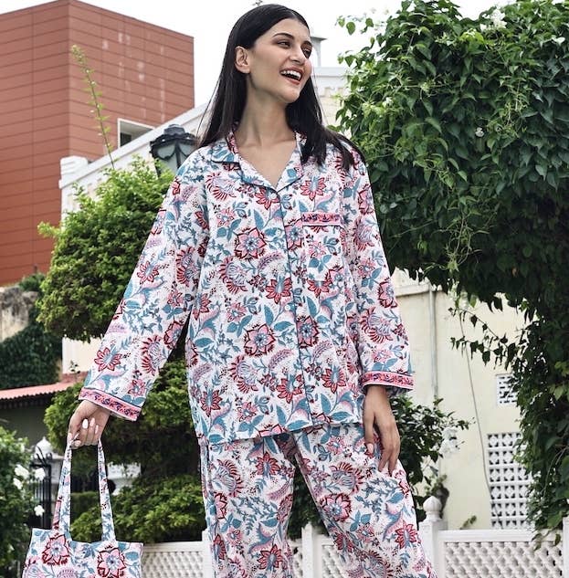These luxurious pajama sets are hand printed using carved wood blocks and the softest, Indian cotton. They are so comfy you will feel like a queen. Each set includes a button down top, pants and a matching bag to store them in. The button-down pajama top has colorful piping all around. The pants have a soft elastic waist and drawstring. The pants have a piped cuff. They are great for lazy Sundays around the house, Netflix and wine, or a chilly evening around the fireplace. They make the perfect Christmas gift! PRODUCT DETAILS: *100% cotton voile *Hand wash and air dry women's pajamas, holiday women's pajamas, pyjamas, PJS, gift idea, gift wrapped gift, gifts for women, christmas gifts, holiday gift