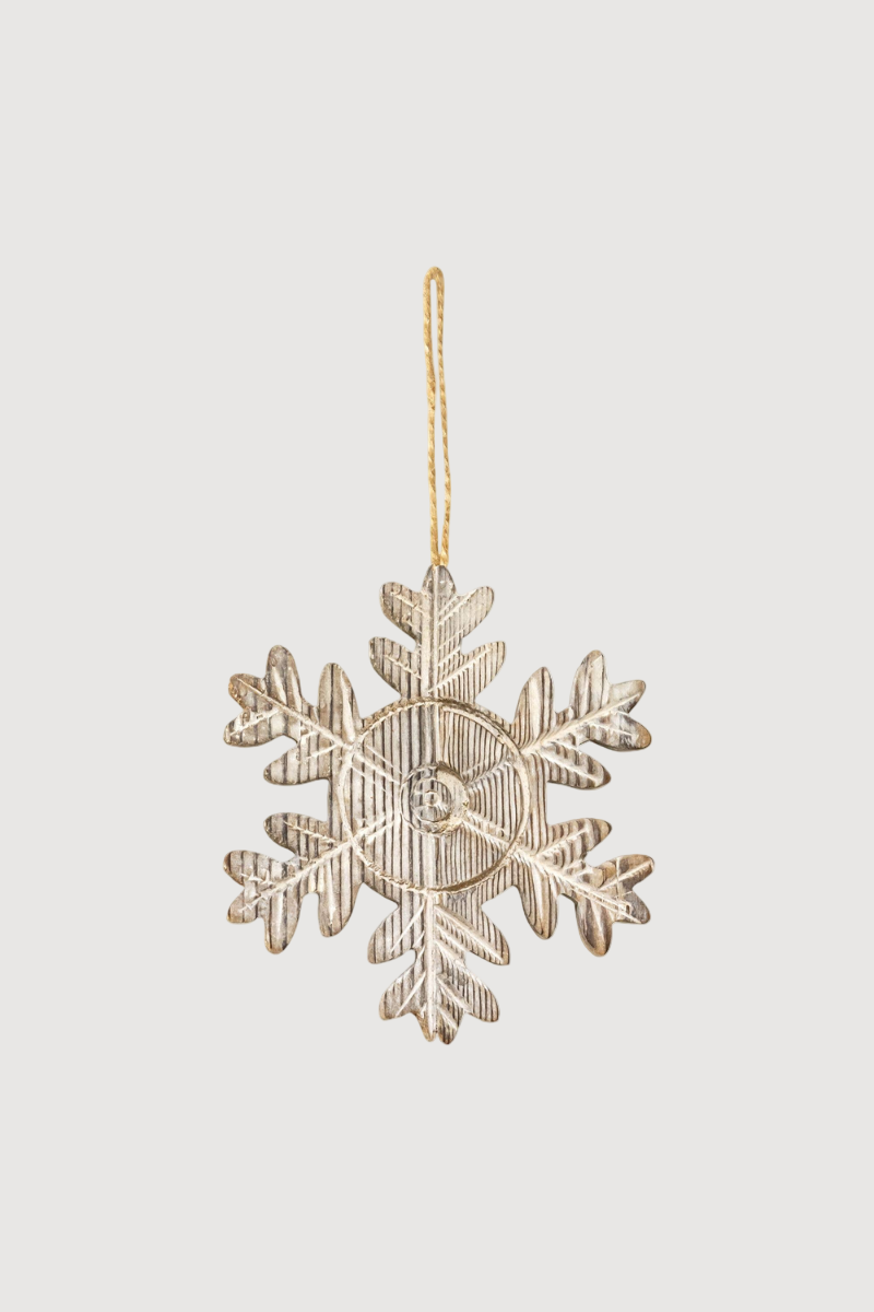 This ornament is a decorative snowflake figurine made of light, natural-grain wood. The snowflake has a traditional carved design and includes a string hanger to use for display. Measures 5” in diameter.